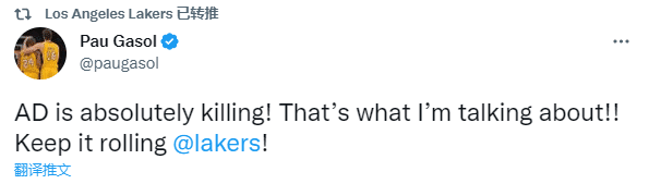 湖人名宿大加索尔发推夸赞浓眉:浓眉绝对是致命的!这就是我所说的!!继续前行吧湖人!