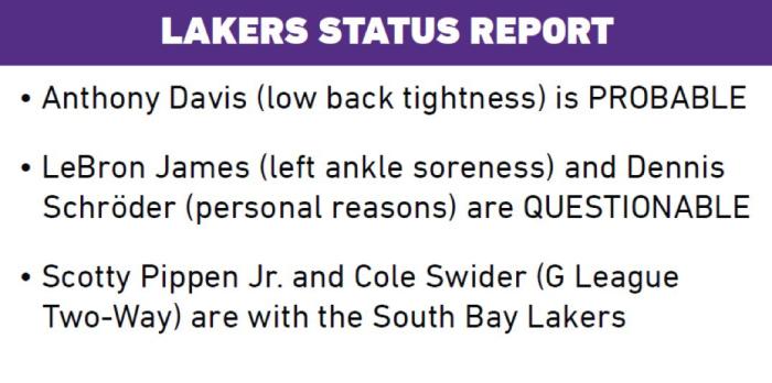 24直播网12月04日,湖人官方公布下一场对阵奇才的伤情,浓眉(背部紧张)大概率出战(75%可能性出战)、詹姆斯(左脚踝酸痛)和施罗德(个人原因)出战成疑(50%可能性出战),小皮蓬和斯威德仍旧跟随南湾湖人打比赛。