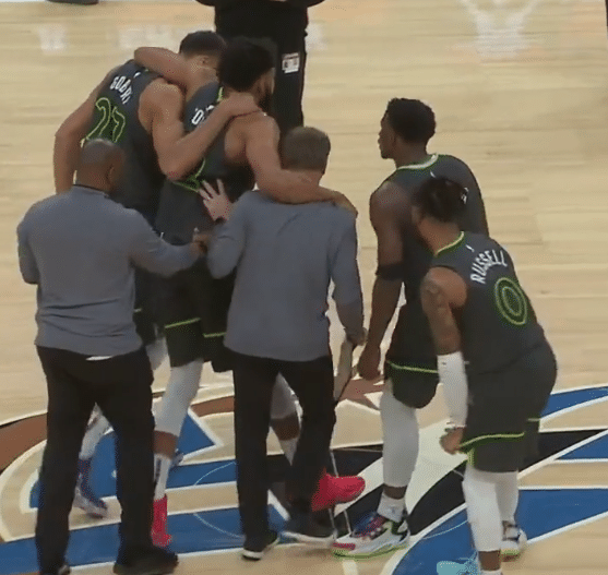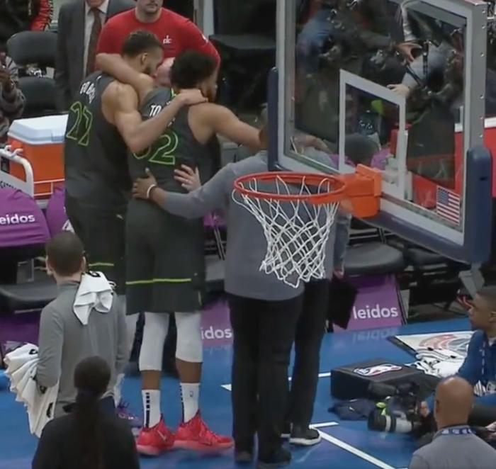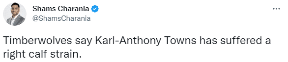 下半场第三节,在一次防守回合中,唐斯从底线跑回去防守,突然遭遇伤病,在没有任何接触和碰撞的情况下,唐斯捂着小腿痛苦倒地,倒地不起无法站起来,右腿无法用力,最终被搀扶返回更衣室接受检查,一瘸一拐十分令人担忧。