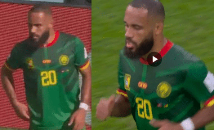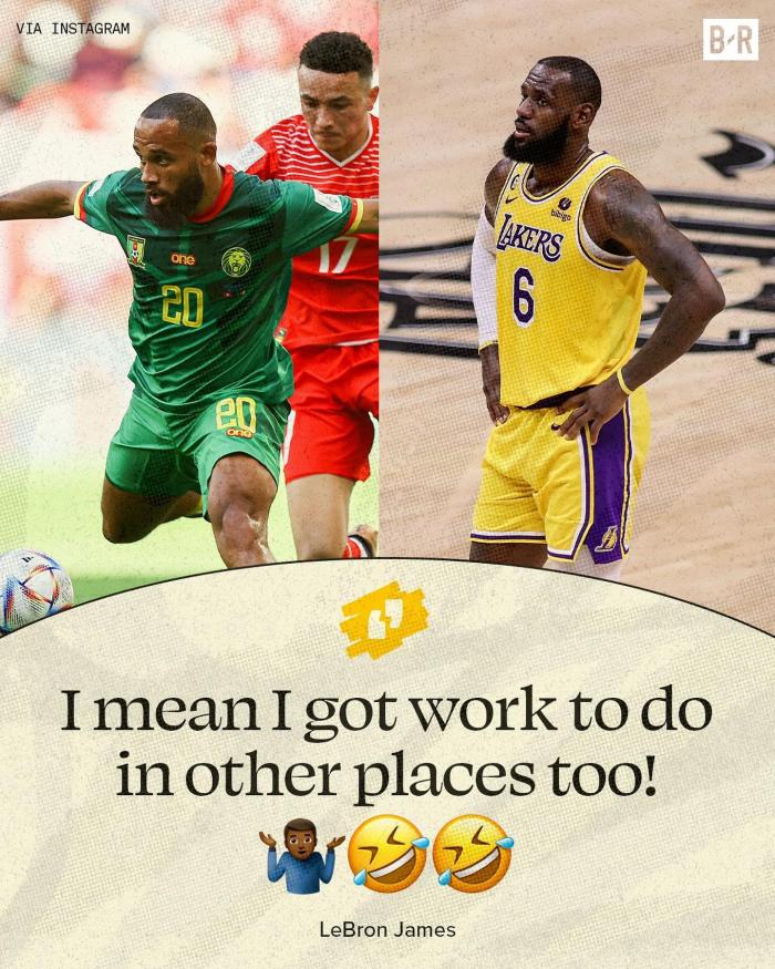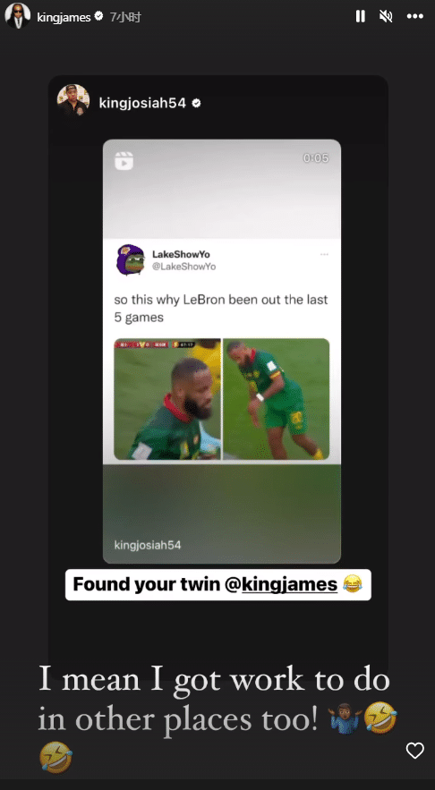 湖人自媒体晒出喀麦隆20号球员姆贝乌莫参加世界杯的赛场照,并且配文写道:这就是勒布朗缺席最近5场比赛的原因,找到了你的双胞胎兄弟。