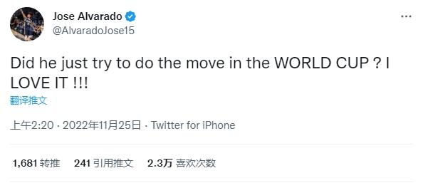 鹈鹕后卫阿尔瓦拉多发推写道:他刚才是想在世界杯完成这个动作吗?我太爱了!