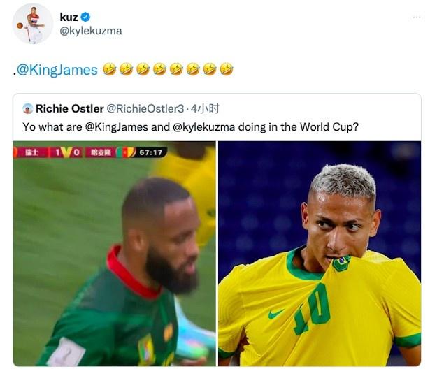 推特账号为Richie Ostler的球迷晒出神似詹姆斯的喀麦隆球员以及巴西球员理查利森的照片,发推写道:“哟詹姆斯和库兹马在世界杯上干哈呢?