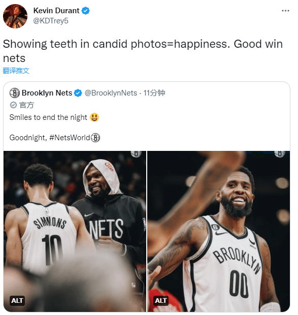 末节篮网牢牢掌控比赛,最终三巨头带队拿下胜利;杜兰特仅拿12分,但在场正负值高达+30,防守端的表现太出色;赛后篮网官方晒照庆祝胜利,配文写道:微笑结束夜晚,晚安;杜兰特转发并且配文写道:在合照中露齿笑就是幸福,篮网很棒的胜利。