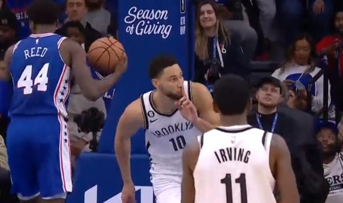 第二节,尼昂在防守时肘击西蒙斯的腹部,本西痛苦地跑到场边,裁判回放之后吹罚尼昂一级恶意犯规;西蒙斯两罚一中,尼昂仍旧不满判罚,之后西蒙斯和前队友激烈互喷,杜兰特站在一旁看热闹。