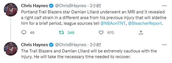 24直播网11月21日,利拉德的检查结果曝光,据名记Chris Haynes报道,利拉德接受核磁共振检查,伤情确诊为右小腿拉伤,这与之前受伤的部位不同,他将缺席近期的比赛。