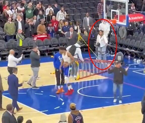 这时候,字母哥有些生气了,他先把梯子推开,但工作人员坚持将梯子复位,字母哥上前更用力地推梯子,这时候梯子失去平衡,倒向底线,差点砸到一个女人和身边的孩子。视频和现场人员证实,差点被砸到的是字母哥的女友和他两岁大的儿子。视频显示,确实有些危险,字母哥的女友上前帮忙扶起梯子后,就转身离开了。