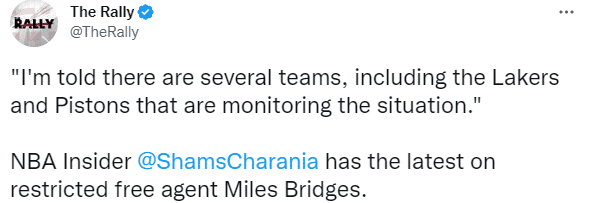 24岁的布里奇斯因家暴事件导致自己未能与黄蜂达成续约,目前仍旧是一名受限制自由球员,他有资格与任何一支球队签约,不过根据劳资协议,NBA有权暂停、罚款、解雇或取消他与联盟的任何进一步联系。