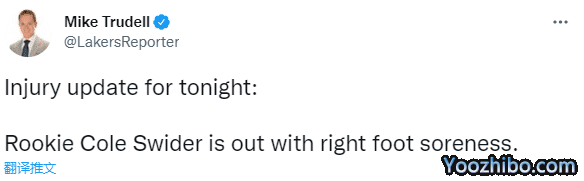 新赛季揭幕战,湖人客场惨败勇士,三巨头轰下77分仍惨败输球;时隔一天,湖人迎来主场揭幕战,对阵同城死敌快船,赛前湖人宣布斯威德因右脚酸痛而缺席比赛,斯威德是今年落选秀,此前对阵勇士仅仅获得2分钟的出战时间,1投0中0分1篮板1助攻。
