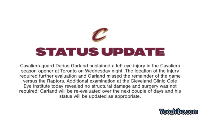 24直播网10月21日,克利夫兰骑士官方更新加兰的伤情,经过进一步的检查,加兰的眼伤没有结构性损伤,也不需要接受手术,他将在未来几天重新接受评估;据骑士记者报道,加兰眼睛肿胀无法睁开,眼球布满血丝,预计他将因伤休战几天。