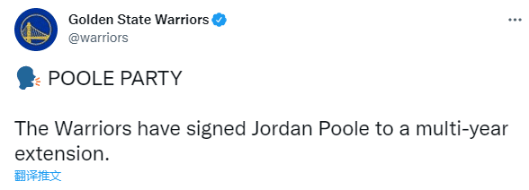 24直播网10月17日,勇士官方宣布续约普尔,勇士官推晒照庆祝并且配文写道:泳池派对,勇士已经和乔丹-普尔签下一份多年续约合同;根据之前的报道,双方签下4年1.4亿美元的大合同;签约后普尔发声并且首次回应冲突事件,恭喜维金斯续约。