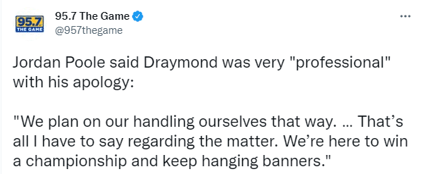普尔续约后首次回应冲突事件,表示格林的道歉非常专业:格林已经道歉了,我们计划以这种方式处理自己内部的事情,这就是我对此事要说的全部内容,我们来这里是为了赢得冠军并继续挂起冠军旗帜。