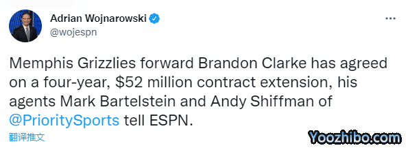24直播网10月17日,据ESPN名记沃纳罗斯基报道,灰熊已经和布兰登-克拉克续约,双方新签一份4年5200万美元的提前续约合同;锡安、莫兰特以及普尔之后,19届又一人提前续约,恭喜克拉克;灰熊一年狂砸3.9亿续约5人,打造冲冠核心阵容。