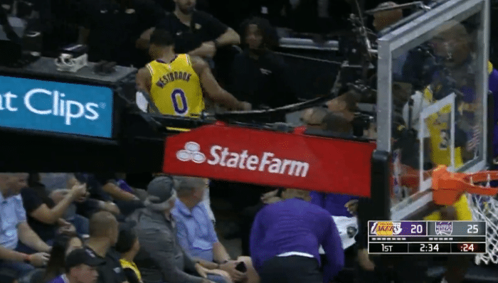 第一节2分34秒,威少下场并且直接返回更衣室,有些沮丧并且有些一瘸一拐;离场前威少没有得分进账,但送出2次助攻;首节打完,湖人23-36落后国王13分,相当于湖人变阵又失败了。
