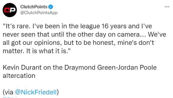 对于格林拳击普尔的冲突事件,杜兰特正式回应,KD接受采访时说了很多话,表示:这次的情况与我和追梦的那次不一样。这次有人的脸被打了,两者完全没有可比性