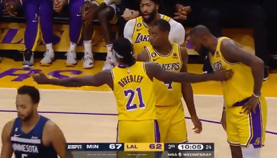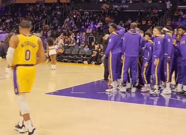 湖人对阵森林狼赛前,湖人全体在球场上围在一圈进行赛前的加油环节,但是威少一个人在替补席脱衣服,随后独自走上场,不过这是被恶意剪辑的;其实在赛前加油环节,詹姆斯和威少激情开场,之后威少跑到替补席脱掉T恤,然后上场。