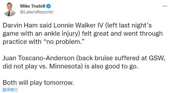 湖人队最新伤情报告出炉,湖人主帅哈姆透露,朗尼-沃克的脚踝伤势无大碍,参加了今天的训练,胡安-托斯卡诺-安德森的背部伤势也没问题,他们两人都将参加明天湖人最后一场季前赛。