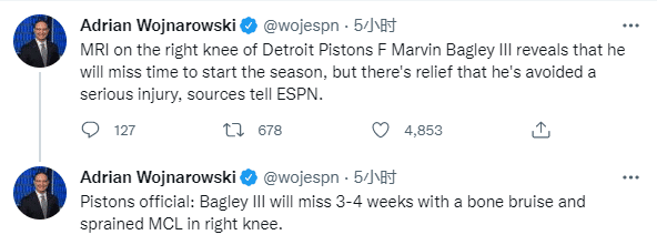 在此前活塞和雷霆比赛中,开场不到1分钟,巴格利在防守时不幸滑倒,无对抗受伤倒地,捂着膝盖十分痛苦,最终被两人搀扶返回更衣室,因伤退出比赛;现在巴格利的核磁检查结果显示,他遭遇右膝骨挫伤以及副韧带扭伤,伤停3-4周。