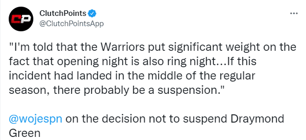 格林未被禁赛的另一个原因是勇士不想让他缺席新赛季的总冠军戒指颁发仪式;据名记沃纳罗斯基透露,我被告知勇士非常重视的一件事是新赛季揭幕战也是总冠军戒指颁发之夜,如果这件事发生在赛季中期,格林很可能被球队禁赛。
