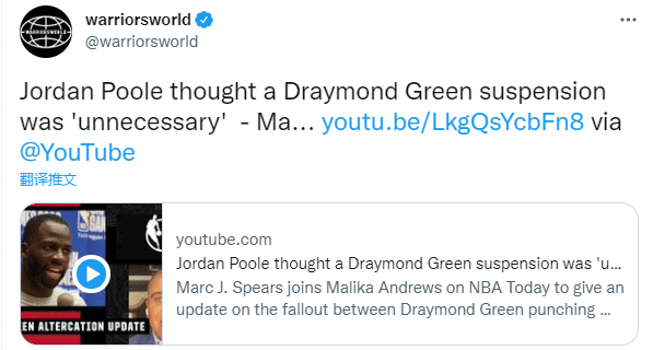对于格林拳击普尔的冲突事件,勇士记者蒂姆-川表示:他离开了球队,让事情平静下来,但现在他回来了,关系仍然会很紧张。压力在一种长期的关系中会变得非常显眼。一些刻意安排与妥协都太明显了,感觉就像有时钟在滴答作响。除本赛季外,追梦与这支球队的未来是令人怀疑的。他今年夏天没有获得顶薪的续约合同,他可能永远也不会得到。显然在此次事件中,他损害了他在整个联盟的价值