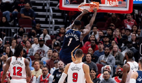第四节,锡安没有登场,这场复出之战对阵公牛,他出战15分钟,砍下13分4个篮板1次助攻1次抢断的数据。