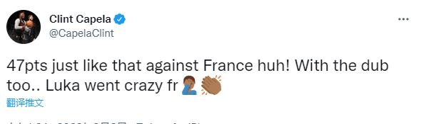老鹰球员博格丹发推写道:昨天扬尼斯砍下了41分,今天卢卡爆砍47分,我已经等不及看约基奇明天的表现了;卡佩拉发推:对阵法国狂砍47分,兄弟卢卡真是太疯狂了。