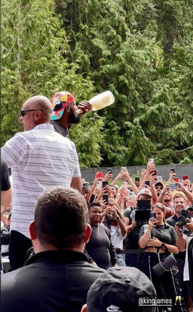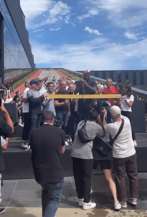 37岁的詹姆斯身穿黑色T恤、反戴棒球帽亮相,现场聚集了很多耐克员工,他们排队夹道欢迎老詹;詹姆斯高呼之后登台,先是尽情泼洒香槟并且猛喝一大口,之后拿剪刀剪彩,并与众人击掌庆祝,这意味着勒布朗-詹姆斯创新中心正式揭幕。