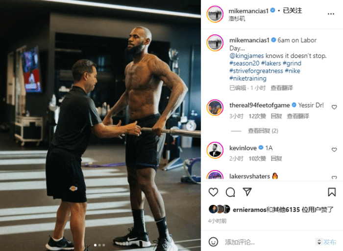 詹姆斯御用训练师迈克-曼西亚斯晒出詹姆斯的训练照,配文写道:劳动节早上6点开始训练,詹姆斯知道他不能停下脚步;湖人助教菲尔-汉迪回复表示赞同,凯文-乐福回复:1A。