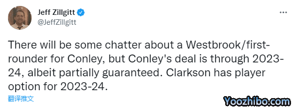 美记者Jeff Zillgitt报道,湖人和爵士两支球队之间会展开一些关于拿威少与首轮签交换得到康利的讨论,但康利的合同在2023-24赛季结束后才会到期,新赛季年薪是2268万美元,最后一个赛季2436万美元为部分保障,而克拉克森拥有2023-24赛季的球员选项。