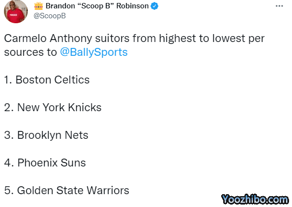 据美记者Brandon Ronbinson报道,安东尼的潜在下家赔率,凯尔特人领跑排名第一,尼克斯第二,篮网第三、太阳第四和勇士第五;由于加里纳利惨遭重伤,凯尔特人有兴趣引援安东尼。