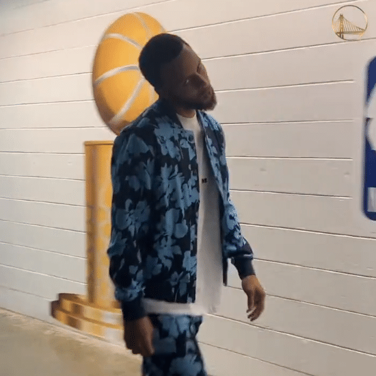 G6赛前,库里身穿蓝色碎花外套和短裤,吹着口哨炫酷入场,面对镜头依旧摆出经典的歪头杀;普尔致敬克莱-汤普森,身穿印有汤普森参加2011年选秀照的T恤,戴着墨镜并且冲着镜头比手势;格林身穿一套黑色服装,浑身都是黑色的;汤普森身穿白色T恤和牛仔裤,脸上全程没有任何表情,G6汤要来了。