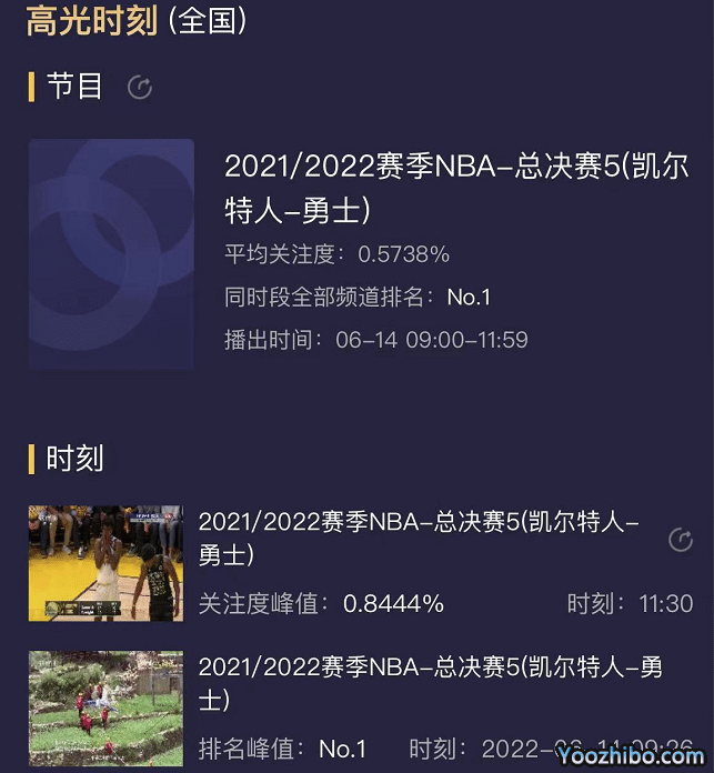 这场比赛的重要性不言而喻,胜利的一方夺得冠军点、系列赛的赛点,再胜一场就可以拿下总冠军,所以外界的关注度非常高,在收视率上也有体现。根据媒体的汇总,NBA总决赛G5,收视率高达0.5738%,巅峰时刻的收视率0.8444%,同时间段排名全国第一。