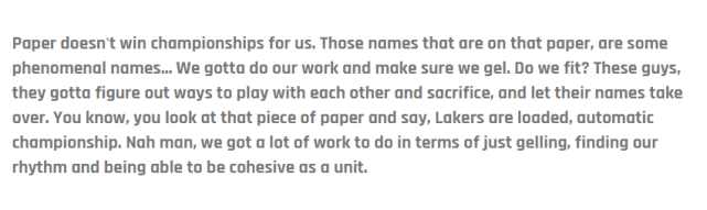 “纸上谈兵不会为我们赢得冠军,那张纸上的名字,都是一些了不起的名字……但我们必须做好我们的工作,并确保大家能融合在一起。我们适合吗?大家必须想办法互相融合,并做出牺牲,如果你光看这份名单,就说湖人已经上膛,自动夺冠,那就错了,我们有太多工作要做,我们需要融合,需要找到节奏,需要成为整体。”
