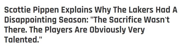 “我只是觉得(湖人)这个赛季缺乏牺牲的精神,”皮蓬说自己从小就是湖人的球迷,“球员们显然很有天赋,湖人引进了一些对比赛非常了解而且仍然能打出很高水平的球员,但我觉得个人层面上来说,他们并没有太多的牺牲。这确实导致这支球队整个赛季都陷入混乱。”