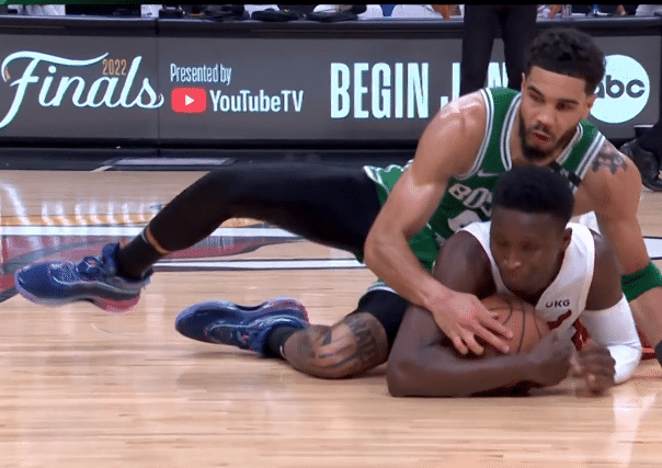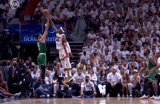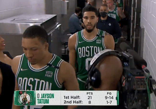 下半场,凯尔特人第三节突然哑火,长达7分钟没有运动战进球,被热火打出22-2的超级攻势,瞬间落后到12分,期间塔图姆连续两次失误,被巴特勒抢断反击得分;之后热火断电,绿军9-2反扑,塔图姆多次站上罚球线,期间他和塔克发生肢体接触,激烈卡位,裁判警告他们,以防事态恶化。