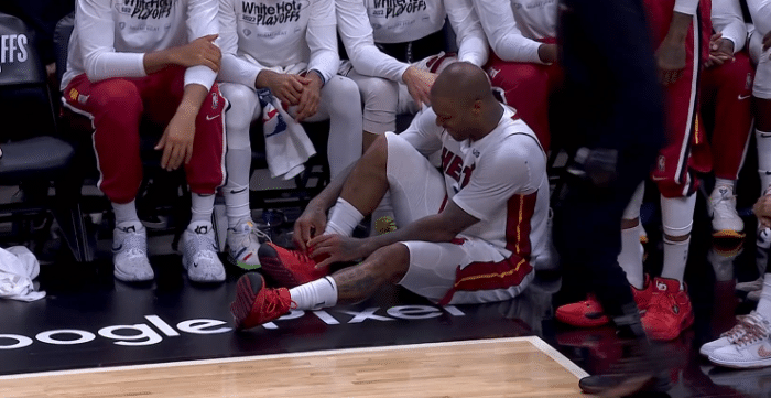 第二节6分25秒,PJ-塔克在一次防守中不幸无接触受伤,右脚受伤后无法坚持,之后他坐在场边并且捂着右脚十分痛苦,热火队医过来问候他的情况,之后塔克一脸痛苦和沮丧,一瘸一拐走回更衣室,接受检查和临时治疗;离场前,塔克上半场出战10分钟,2投1中拿到2分2篮板1助攻。