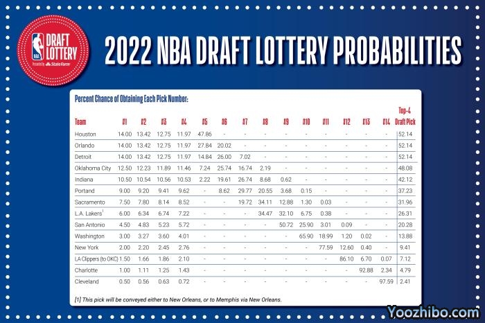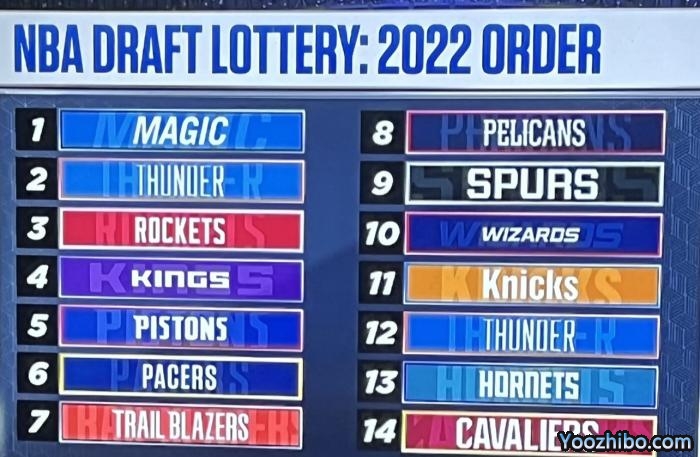 具体抽签结果是,骑士第14顺位、黄蜂第13顺位、黄蜂第12顺位、尼克斯第11顺位、奇才第10顺位、马刺第9顺位、鹈鹕第8顺位(原本属于湖人)、开拓者第7顺位,步行者第6顺位,活塞第5顺位。