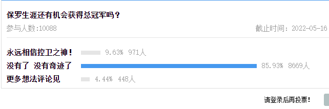 很快就有媒体针对“保罗生涯还有机会获得总冠军吗?”的相关话题组织球迷参与投票,吸引了上万人的参与。根据统计的数据可以看出来,力挺保罗职业生涯中依旧可以获得总冠军的球迷只有不到10%,大部分人都认为保罗球员时代想要获得总冠军的希望已经没有了。
