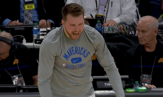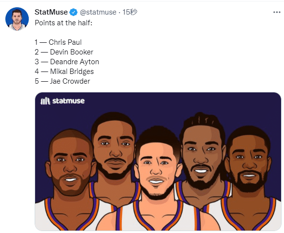 第二节,东契奇休息时,丁威迪又连中三分助独行侠扩大领先,卢卡站在场边疯狂庆祝;东契奇上场后再次砍分,单节独砍15分打爆太阳,独行侠19-8之后又打出11-2攻势,单节狂赢20分太疯狂;独行侠半场领先太阳30分,太阳双星保罗和布克半场11投0中,仅贡献3分,首发五虎得分是1分2分3分4分和5分。