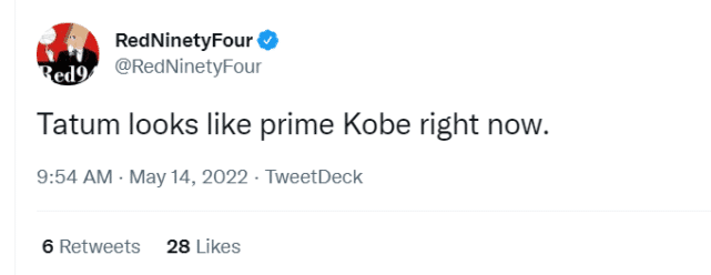 塔图姆在首节就状态不俗,单节6中3,命中了3记三分球,得到9分。第二节,塔图姆10中4,又得到9分,上半场塔图姆已经拿下18分。他在下半场更加犀利,第三节拿到12分,而最后一节,塔图姆再次爆发,轰下16分, 彻底锁定胜局。他全场投中了7记三分,差点追平季后赛生涯纪录,而且他在最关键的一节有极其神勇的发挥。