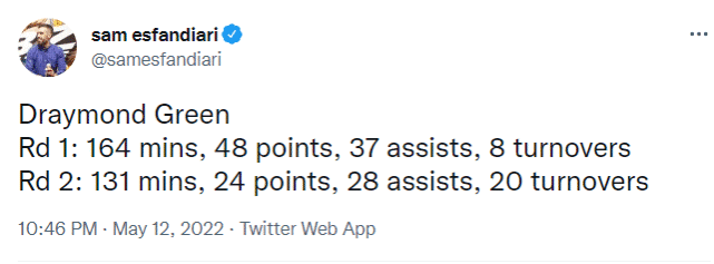 勇士一方,追梦的失误问题严重。NBA记者Sam esfandiari今日统计了追梦首轮与次轮的数据:首轮4比1击败掘金,追梦出战164分钟,得到48分37助攻,只有8次失误。次轮目前3比2领先灰熊,追梦出战131分钟,得到24分28助攻,但已有了高达20次失误。