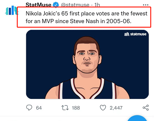 24直播网05月12日讯 约基奇连庄MVP却打破一尴尬纪录,国外网友嘲讽:媒体把他吹得太过头了!NBA季后赛打得如火如荼,常规赛MVP奖项在近日正式公布,掘金队的尼古拉-约基奇成功蝉联常规赛MVP,成为了NBA历史上第13位连续两年拿到常规赛MVP奖项的球员。拿到MVP本该是一件皆大欢喜的事,可约基奇却因此陷入了尴尬。在本赛季的常规赛票选中,约基奇仅拿到65票首选票,是自05-06赛季纳什当选MVP以来得票数最低的球员。