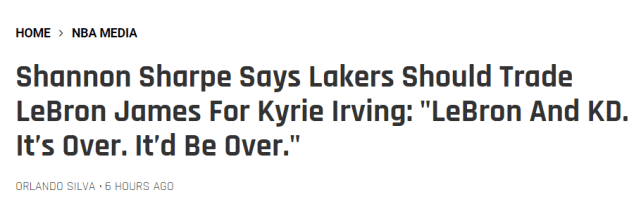 最近一期的播客节目上,名嘴夏普和“头号詹黑”斯基普-贝勒斯曾经探讨过交易詹姆斯的话题。当时的由头是湖人曾在本赛季早些时候评估过换来欧文的可能性,只是最后未能付诸实施。