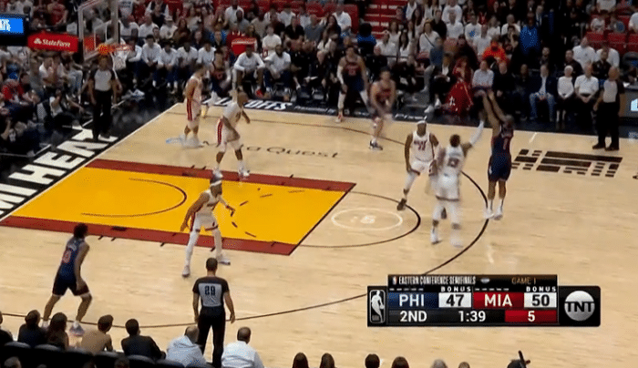 76人悍将塞布尔在防守希罗的时候被吹三分球犯规,这是希罗准备在外线出手三分球,塞布尔想要封盖,他并未碰到球,也没有碰到希罗,但是裁判给的却是三分球犯规,希罗获得三罚的机会。