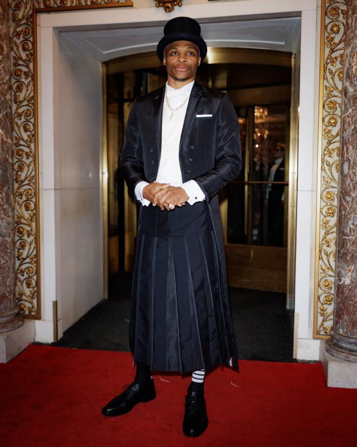威少身穿黑色礼服和礼帽、穿着一条黑色百褶苏格兰裙和黑色皮鞋,亮相Met Gala走红毯;威少如此潮流的造型遭吐槽,有球迷表示我现在明白为什么杜兰特离开他了;还有球迷表示联盟中没有人愿意和他当队友,更有球迷晒照恶搞威少防住了詹姆斯。