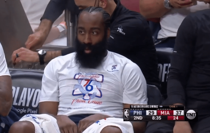 24直播网05月03日讯 ,NBA季后赛分区半决赛,76人客场92-106不敌热火,大比分0-1落后;恩比德因面部骨折和脑震荡而缺席比赛,哈登带队出战,全场13投5中、三分7中2拿到16分9篮板5助攻5失误,如此状态的哈登惨遭吊打,第三节在场上怒瞪队友泄愤,末节5-18溃不成军,提前放弃比赛。