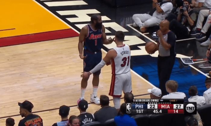 下半场,哈登助攻小乔丹空接扣篮,哈登接连两次三分打铁,热火一波攻势反超比分,之后希罗和文森特助热火扩大领先,78-68领先10分;暂停回来,哈登急停抛投得分,造犯规两罚全中,76人落后8分进入末节;第三节最后2分钟,76人和热火都陷入得分困境。