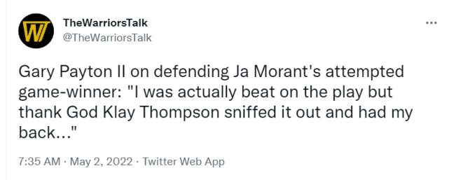 佩顿二世赛后称赞了克莱的补防“其实那时候我已经被莫兰特过掉了,”佩顿二世说,“但感谢上帝,克莱嗅出了危险,并过来给了我帮助。”