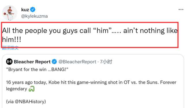 24直播网05月02日讯 16年前的今天,也就是2006年5月1日,湖人太阳的季后赛首轮G4,科比常规时间最后时刻上篮实现绝平,紧接着在加时赛用一记压哨跳投绝杀对手。奇才球星库兹马今天在社媒上转发了科比双绝杀视频,并写道:那些所谓的“科比接班人”一点也不像。