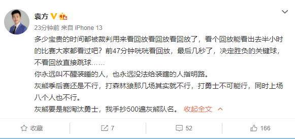 比赛结束之后,知名篮球记者袁方在社交媒体上抨击裁判,他表示:多少宝贵的时间都被裁判用来看回放看回放看回放了,看个回放能看出去半小时的比赛大家都看过吧?前47分钟咣咣看回放,最后几秒了,决定胜负的关键球,不看回放直接跳球……