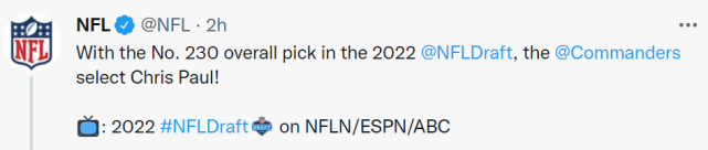 24直播网05月01日讯 ,2022年NFL选秀正式开启,华盛顿指挥官队在第7轮总第230位选中了克里斯-保罗,显然,这位NFL新人和太阳球星克里斯-保罗同名同姓。有趣的是NFL官媒还补充调侃道:“不,不是那个克里斯-保罗。”这一句引来不少球迷点赞,还有球迷表示看到这句调侃忍不住笑了。